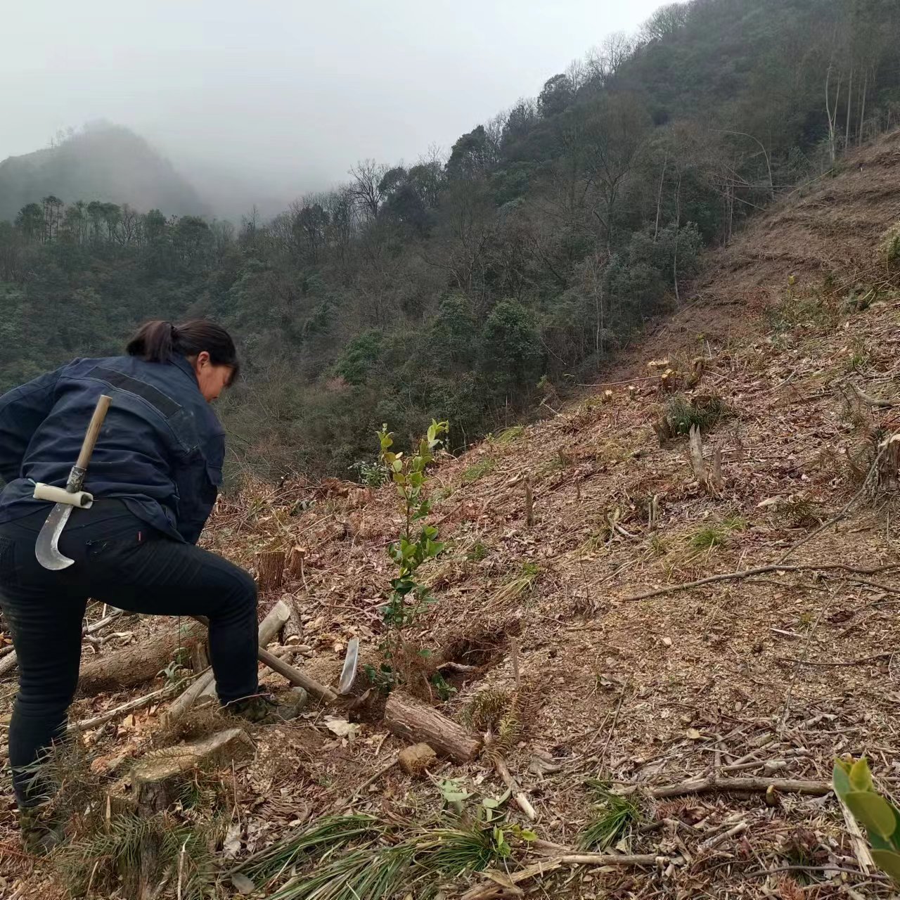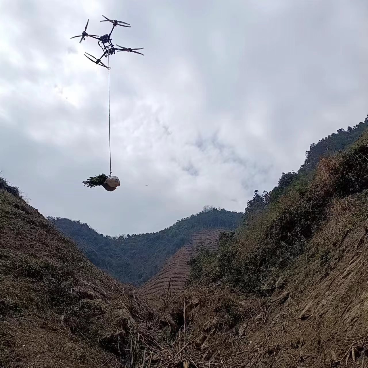 一年四季在于春,當(dāng)前正是植樹造林的黃金時(shí)節(jié),幽靜的黃山六百里桃源野茶谷內(nèi)傳來“隆、隆”的轟鳴聲,一架無人機(jī)在山谷里來回穿梭,將樹苗從山腳運(yùn)到山頂,十幾位造林工人忙著挖穴、栽苗、培土,奮戰(zhàn)正酣,一株株栽上的油茶苗,在春光的映襯下,生機(jī)勃勃。